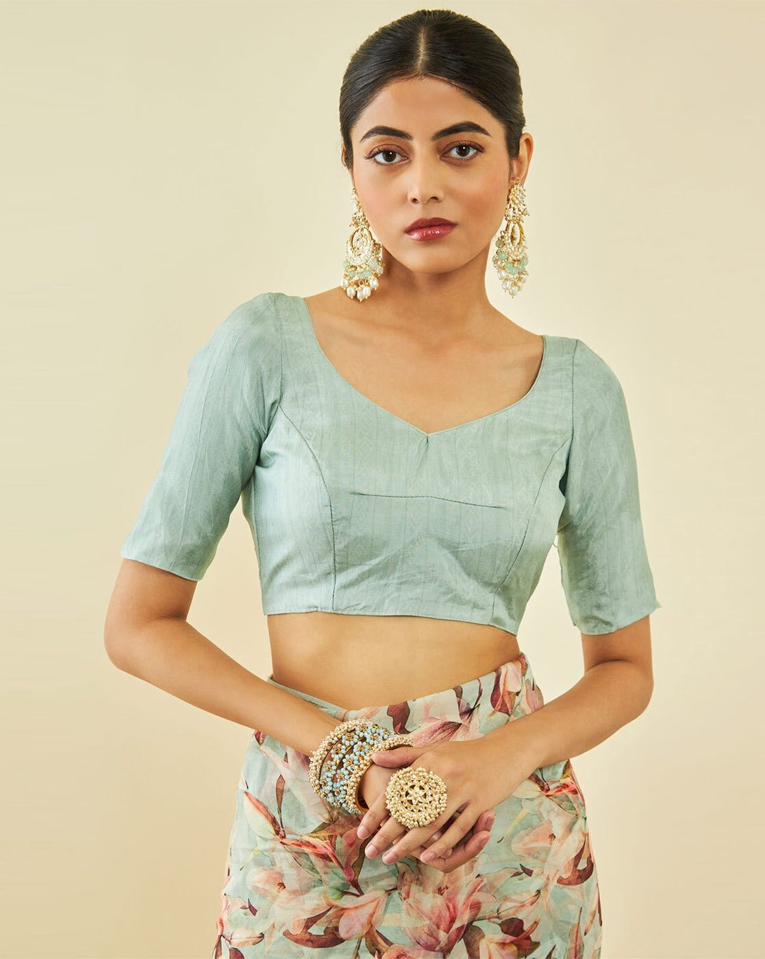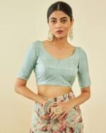 - The last image gives a detailed look of the blouse piece that comes with this saree (The model is wearing a blouse from our in-house wardrobe)
